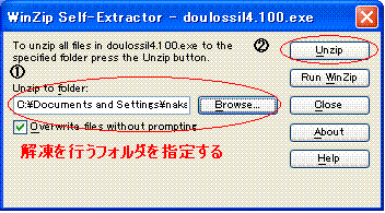 ダウンロードしたファイル、"doulossil4.100.exe"をダブルクリックし実行します。(WinZip の自動解凍画面が表示されます。)