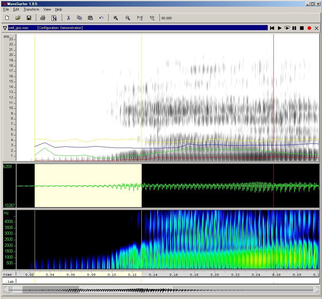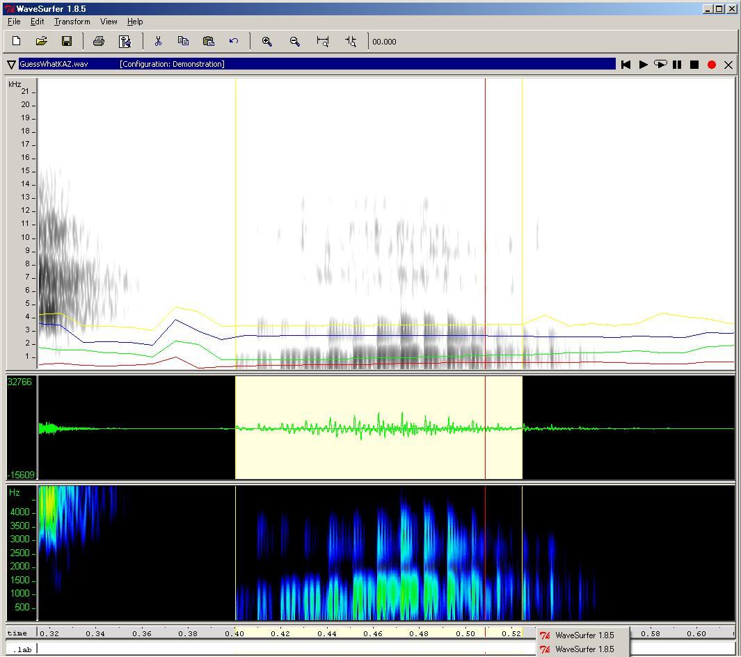 今回の記事で使用した wavesuferの画面は、「Configuration」として "Demonstration"を選択し、更に"Formant Plot"ペインを追加したものです。