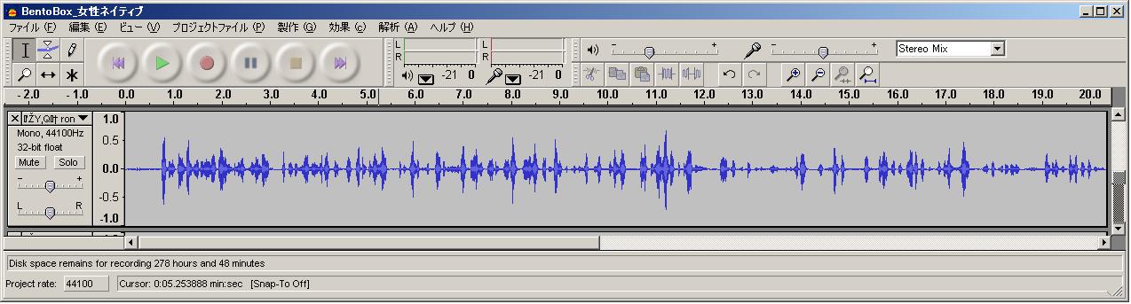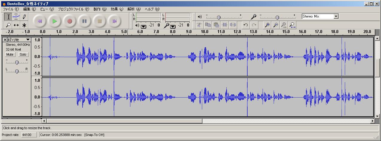 上手ではない方の音声波形は下記の様にはなりません。子音が小さく殆ど見えず、