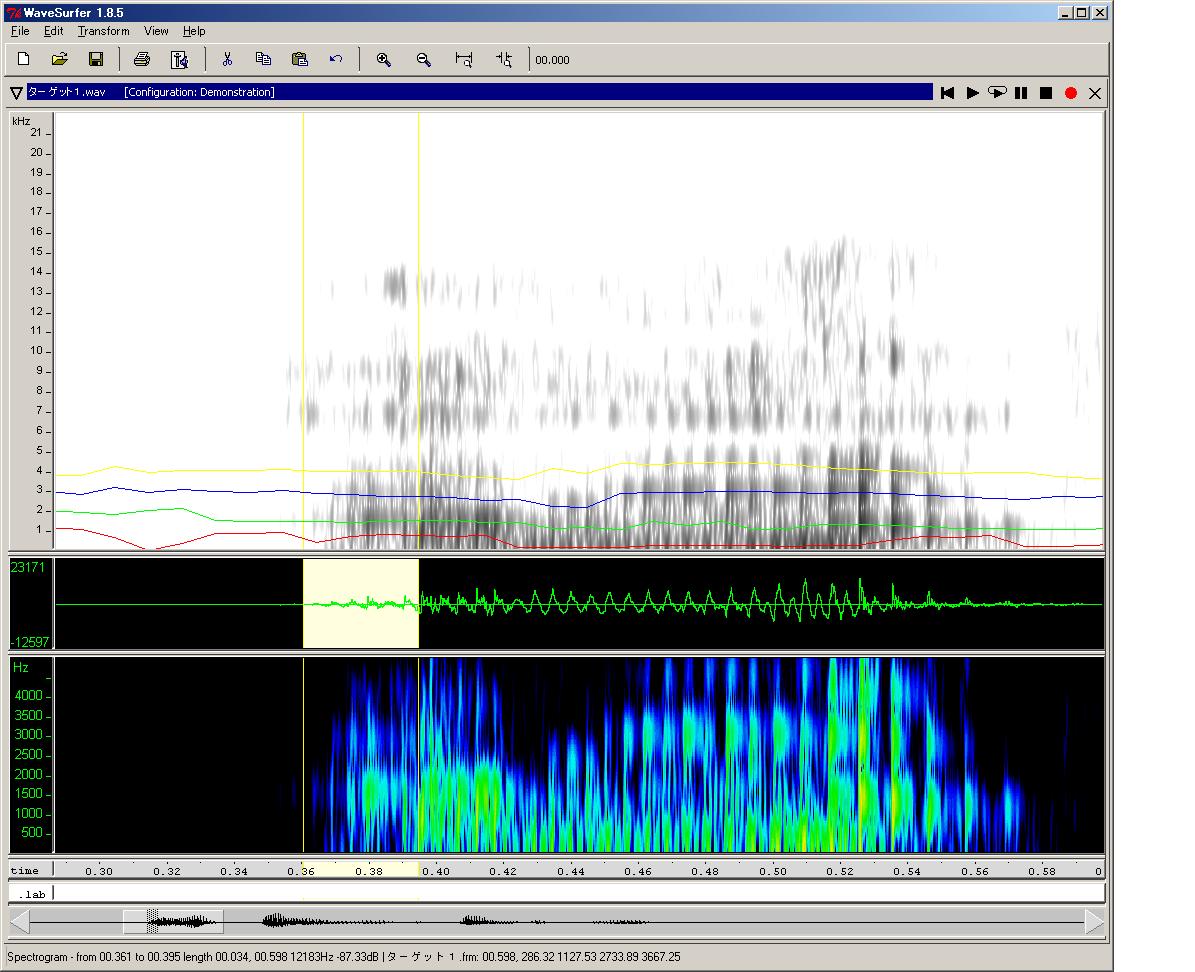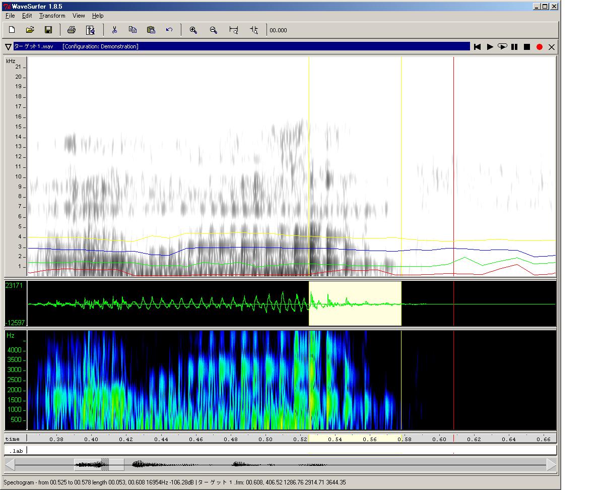 今回の記事で使用した wavesuferの画面は、「Configuration」として "Demonstration"を選択し、更に"Formant Plot"ペインを追加したものです。
