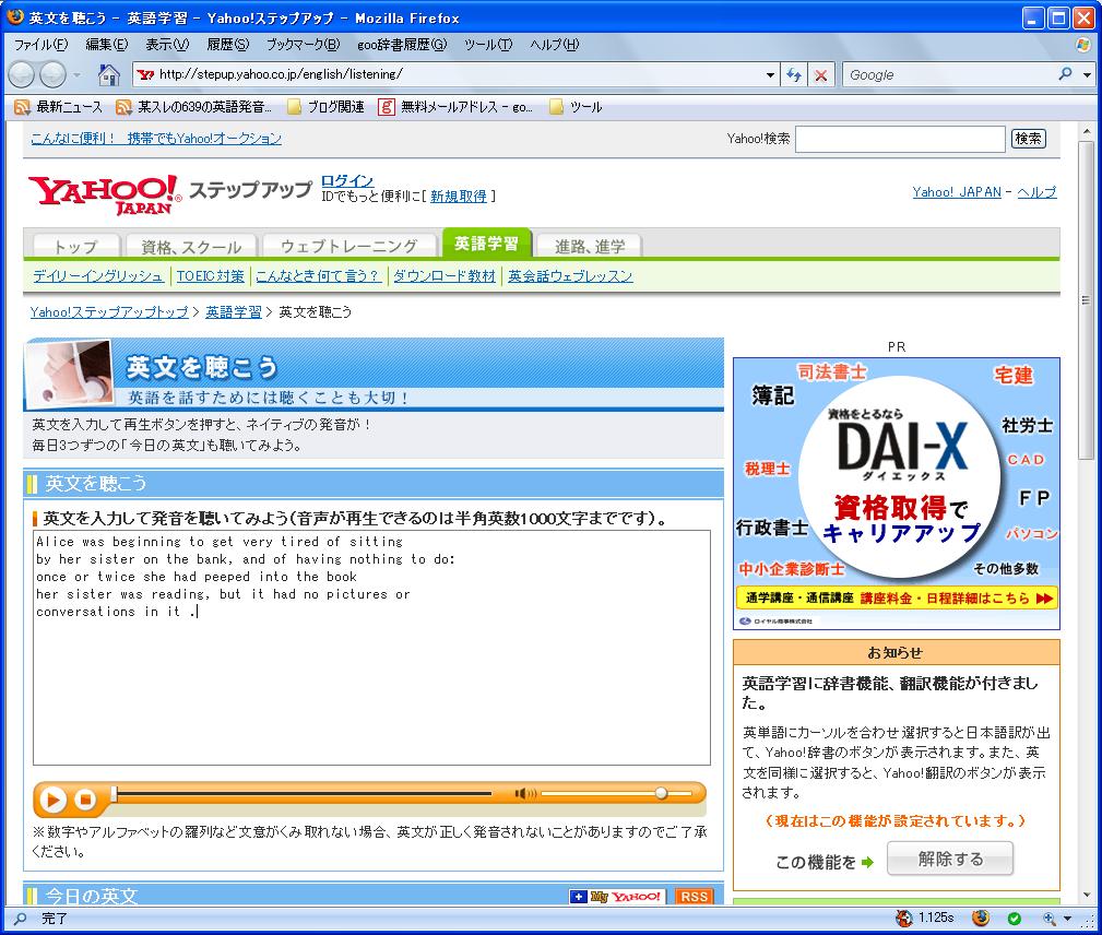 WebブラウザFireFox向けの、英文の読み上げプラグイン "CLiCk, Speak" を使用すれば、英文で書かれたWebページを読上げてくれます。