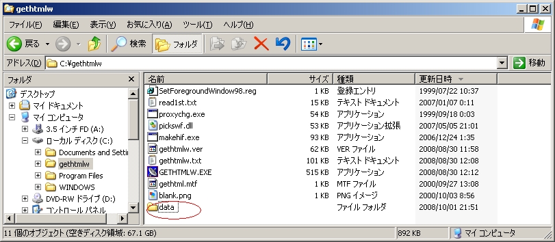 私の環境では、C:¥gethtmlw¥dataというディレクトリを作成しました。