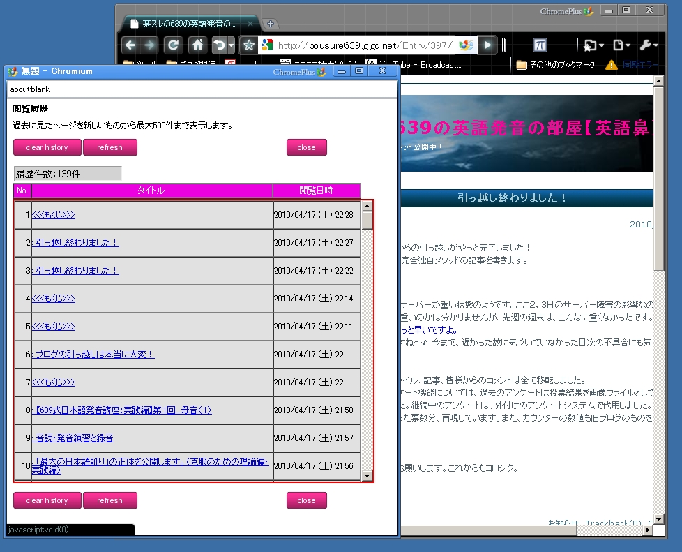 当ブログの閲覧履歴機能は、過去に閲覧したページのURLを記録しています。記録場所は、当ブログの訪問者、ご自身のPCの中です。ブラウザのクッキーという形で保持しています。ちょうど、ニコニコ動画の閲覧履歴と同じです。「以前、どのページを見たっけ?」と言うようなときにお使い下さい。過去に閲覧したページを表示することが可能です。